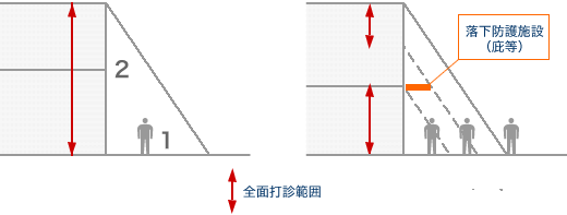 | ※2 | バリケード、落下物防護ネット張りなどがある場合。ただし、これらの対策は、応急的なものであるため、なるべく早期に全面打診等の実施により安全を確認し、必要に応じて、外壁改修又は壁面直下における鉄筋コンクリート造、鉄骨造等の強固な落下物防護施設(屋根、ひさし等)の設置等の措置を講じることが望まれます。 |